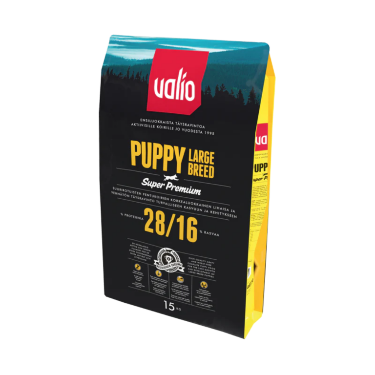 Valio Puppy Large Breed on suurten rotujen koiranpennuille suunnattu laadukas täysravinto (koiran oletettu aikuispaino yli 25 kg). Ruoka sisältää kaikki pennun turvalliseen kasvuun ja kehitykseen tarvittavat ravinto- ja hivenaineet sekä vitamiinit, joten ylimääräisille ravintolisille ei ole tarvetta.